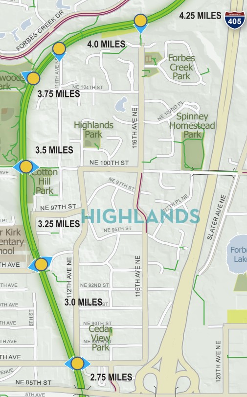 - At NE 87th St. (note the kiosk and landscaping that are maintained by Highlands volunteers)