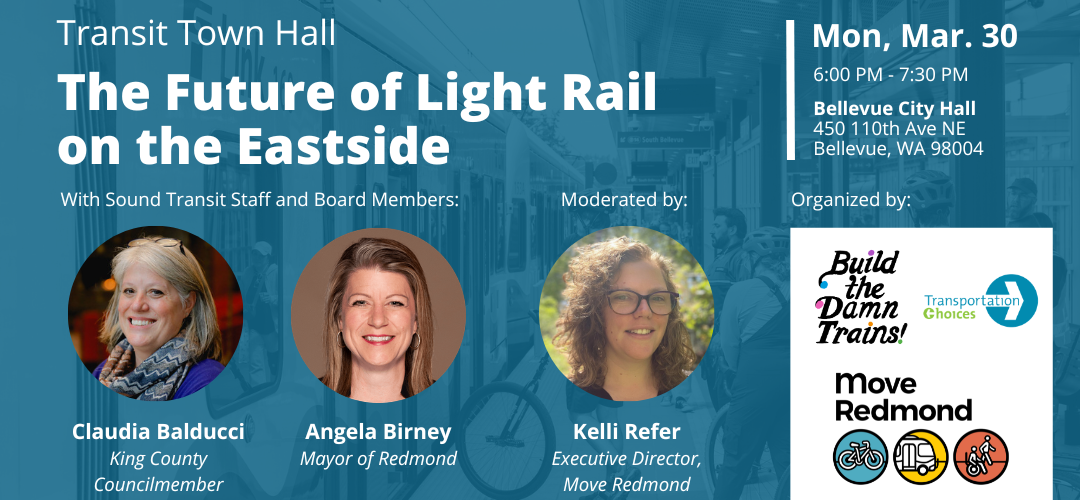 In the coming weeks, the Sound Transit Board will need to make key decisions about the future of the 4 Line and the system as a whole. To learn more and lend your voice to the Sound Transit Board’s decision,join a hybrid community town hall on Monday, March 30, hosted by Transportation Choices Coalition and Move Redmond.